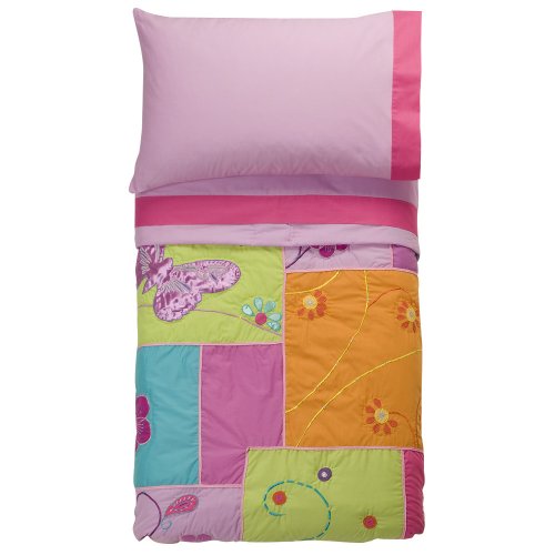 I bought this for my 17 month old granddaughter to use as she transitions from a crib to a toddler bed. It must have been a hit because as soon as we opened the package she said "mine" and snuggled into it. The colors are so vibrant and the quality seems to be very good. Brightly colored blocks of fabric are outlined with pink braid and accented with embroidered flowers and butterflies. The comforter washed well. It is not too heavy, not too light. It's comparable to her other baby quilts, not lofty like a comforter. The sheets were pretty wrinkled after washing but they smoothed right out on the mattress. Not wanting to be tied to a "theme room" this will be great because it can be accented in so many ways. The flowers and butterflies are very detailed with a little paisley thrown in. I can see this being a style that could be used for years. I'm glad it's available in other sizes.