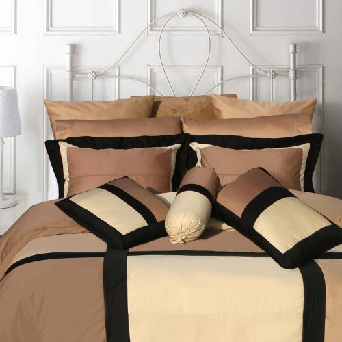 This 7-piece bedding collection has everything you need to wake up your bedroom decor and give it a complete new look. Featuring patchwork in cafe, sunshine, gold and black colors to create a chic and stylishly modern look. Made of 350 and 500 TC Egyptian Cotton Sateen with single-ply construction to provide super-soft and smooth feel. Hemstitch on the comforter and shams adds a touch of unique detailing and luxorious look. Comforter and other components of the set are designed and stitched to offer easy care and are machine washable. Reverse is made of Black 350 TC Egyptian Cotton Sateen offering you two different looks in one.