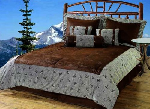 High quality, luxury super oversized comforter set features an overstuffed faux fur border with branding around the edge with corded edge. Luxury microsuede center in brown. Two matching decorative pillows & neckroll in microsude, faux fur and brass conchos. Pillow shams are also distress faux leather micro suede with faux fur edging. Matching brown micro suede dust ruffle.