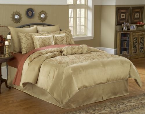 - An elegant set with clean lines. Champagne gold with the center insert in a paisley print. Accent pillows are fringed and bolster pillow has tassels on each end. Sublime elegance.