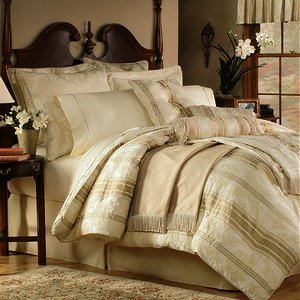 Enjoy a taste of the posh life with the Grand Bellagio ensemble. Each 22-piece bed set includes comforter, bedskirt, 2 standard/king shams, 2 Euro shams, throw, 2 flat sheets, 2 fitted sheets, 4 pillowcases, 4 valances, 1 square pillow, 1 rectangle pillow, and 1 neckroll pillow. Specify Burgundy or Ivory.Cotton/polyester comforter face is burgundy or ivory with vertical golden stripes of varying width. A subtle, all-over damask design gives the corded, throw-style comforter an ornate appearance. Polyester/cotton reverse has an all-over damask design. Solid gold, soft shell bedskirt with 15" drop has kick-pleat and split corners; reverses to a darker coordinating color. Striped shams have damask design, cording, and reverse to coordinating damask.Striped European Sham has cording and all-over damask. Reverses to damask.Throw blanket has stripes with all-over damask and bullion fringe on two ends. Reverses to solid color.Washable Sheets are 250 thread count, pure cotton. Flat and pillowcases have attached self hems. Fitted has elastic all around and fits up to a 15"D mattress. Set includes two sheet set styles: Embroidered Sheets have gold vine scrolls on solid color fabric. Piped Sheets have satin piping on solid color fabric.Gathered valances are striped with damask design and 3" pockets.Pillows: Tufted Square is striped all-over damask, knife-edge, and a fabric-covered button. Rectangle has an inset of stripes with damask, flanked by insets of ruched gold with gimp trim. Ends are damask with tassel fringe. Neckroll has an inset of stripes with damask, separated from solid gold by gimp trim. Solid color ends have bullion fringes.Bedding is cotton/polyester with a polyester/cotton reverse. Polyester fill. Sheets are cotton. Imported.Dry clean. Sheets are washable.