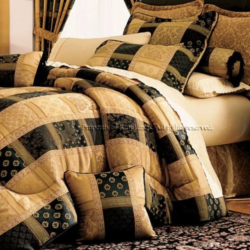 Mysterious combinations of deep jeweled toned patterns and colors are boldly patched together. In woven colorful yarns, it's destined to be a stunner on any bed.Matching curtains available. Features Size: Queen Colors: Black/Gold Face:55% Polyester / 45% Cotton Backing: 80%Polyester/20%Cotton Machine washable This set includes:1 Comforter (88"x92")2 Standard Shams (20"x26"+3")1 Bed Ruffle (60"X80"+14")1 Neckroll (9"X15") 1 Square Cushion (16"x16") 1 Rectangulare Cushion (16"X16")